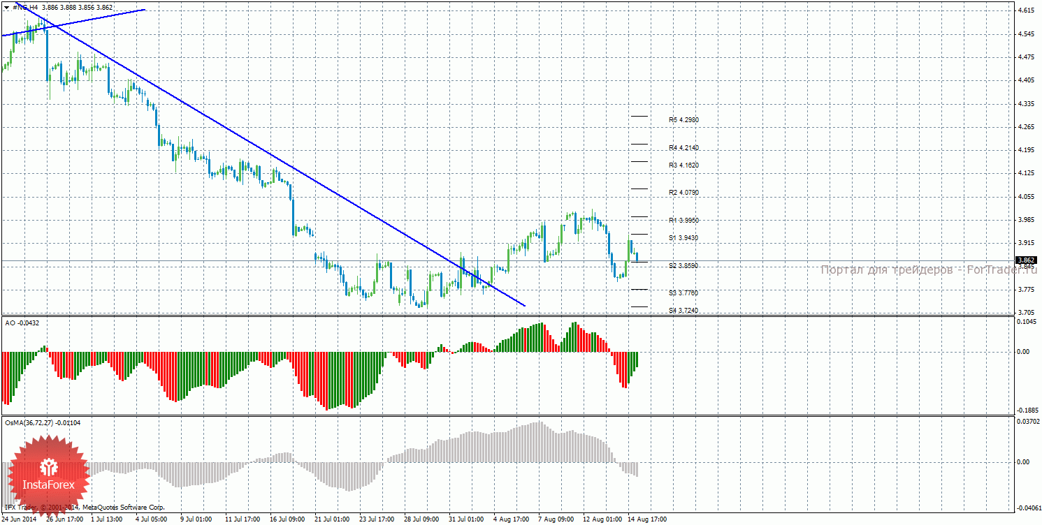 Анализ природного газа за 15 августа показывает, что цена закрепилась выше уровня 3,8590 и может попытаться возобновить восходящее движение. На данный момент актуально восходящее движение с целями уровни S1 – 3,9430 и R1 – 3,9950, если цена останется выше уровня 3,8590. Целями для продолжения нисходящей коррекции выступают уровни 3,7760 и 3,7240, если цена закрепится ниже уровня 3,8590. Нисходящая линия тренда больше не оказывает поддержку торгующим на понижение, цена закрепилась выше, стали актуальными ордера на покупку. Восходящей линии тренда пока что нет. Индикатор Awesome показывает локальное восходящее движение, последний закрытый бар окрашен в зеленый цвет. OsMA направлен вниз, что сигнализирует о нисходящем движении цены на газ в более долгосрочной перспективе. Отскок от уровня 3,8580 может спровоцировать продолжение восходящего движения.