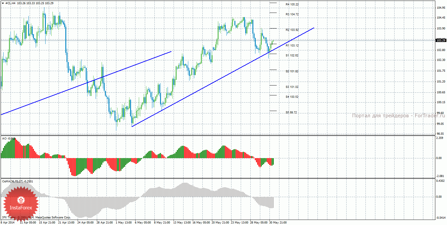 В ходе проведенного анализа движения цены на нефть, можно сделать вывод, что сейчас можно рассматривать ордера на покупку с целями 103,92 и 104,72. Стоп лосс выставляем ниже ближайшего уровня поддержки. При заходе сделки в прибыльность в безубыток. Если цена отскочит от уровня 103,92, это может засвидетельствовать новый виток нисходящей коррекции, как и разворот вниз Awesome или OsMA. Короткие позиции сейчас не актуальны.