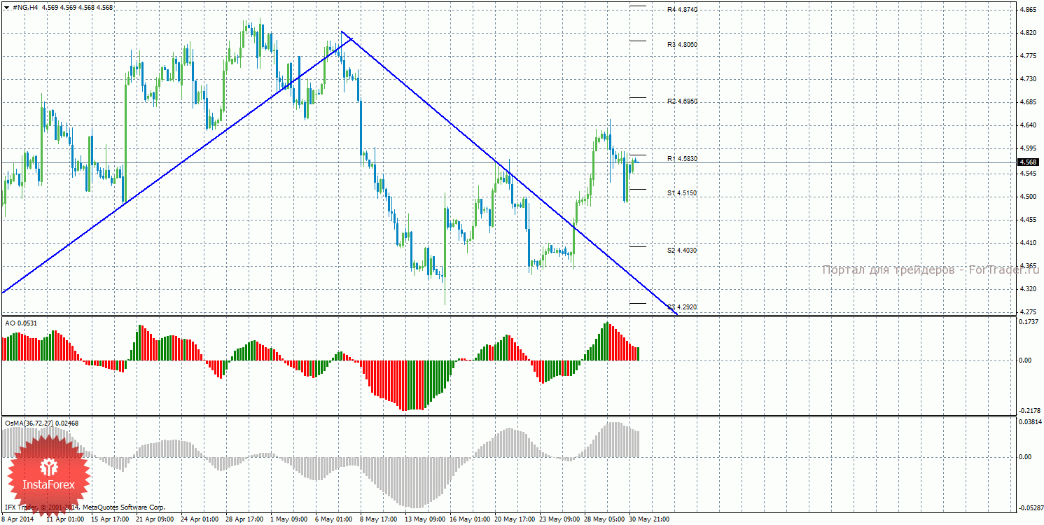 Анализ природного газа за 2 июня показывает, что цена в начале новой недели располагается между уровнями S1 и R1 и не определилась с направлением движения. На данный момент актуально восходящее движение с целями уровни сопротивления R2 – 4,6950 и R3 – 4,8060, если цена закрепится выше уровня 4,5830. Целью для нисходящей коррекции выступают уровни 4,5150 и 4,4030, если цена отскочит от уровня 4,5830. Цена закрепилась выше нисходящей линии тренда, поэтому нисходящее движение сейчас не актуально и можно рассматривать ордера на покупку. Индикатор Awesome показывает локальное нисходящее движение, последний закрытый бар окрашен в красный цвет. OsMA также направлен вниз, что сигнализирует о нисходящем движении цены на газ и в более долгосрочной перспективе. Отскок цены от уровня 4,5830 может спровоцировать виток нисходящей коррекции.