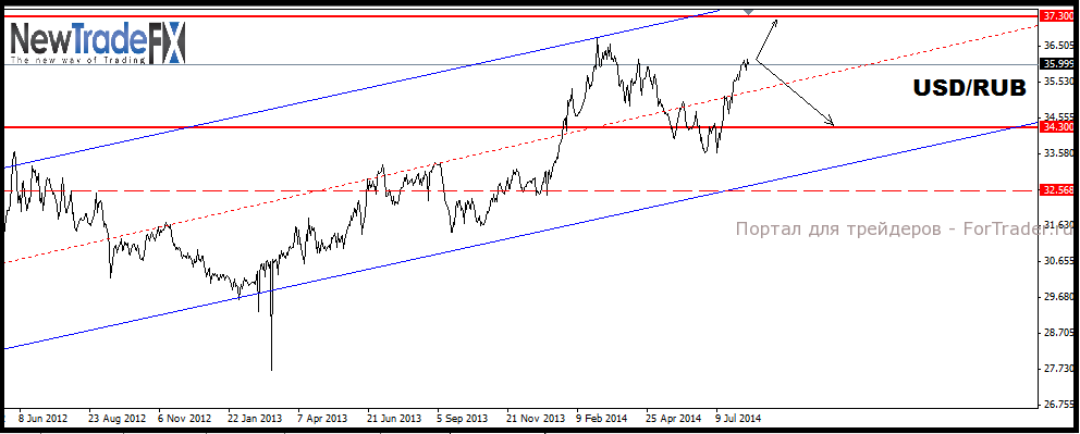 С технической точки зрения, на графике цены присутствует явный тренд на повышение доллара США по отношению к рублю. Ближайшие уровень сопротивления ожидается — 37.3.