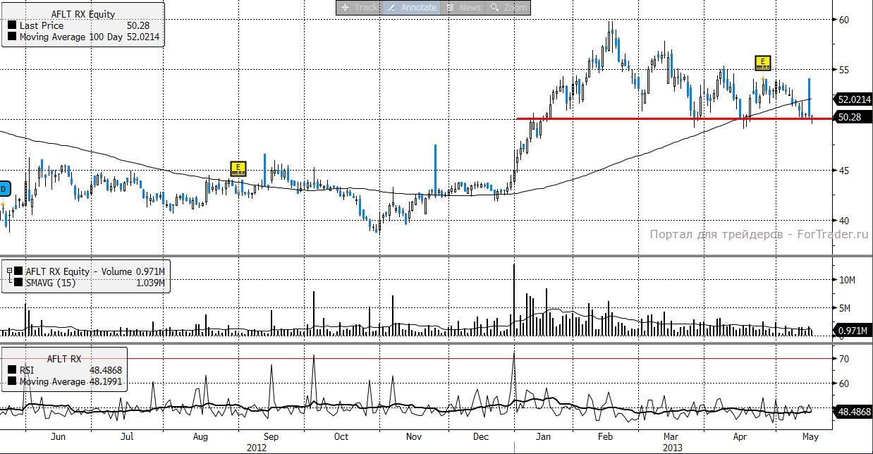 После отчетности акции Аэрофлота продемонстрировали падение с 55 до 50 руб. за акцию. Однако на наш взгляд негатив по эмитенту подходит к концу и быкам стоит присмотреться к сигналам на покупку. Цены находятся на уровне поддержки в условиях восходящего тренда, определенного по 100-периодной скользящей средней. RSI находится в зоне перепроданности. Вывод — пора покупать.
