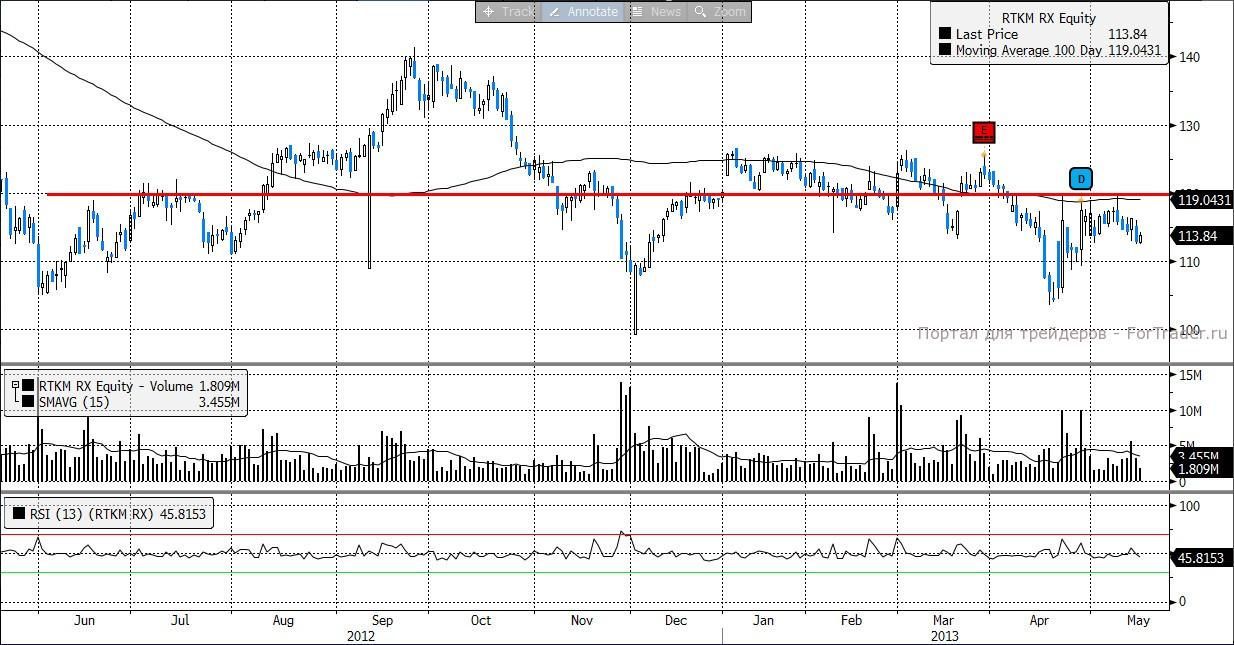 На Ростелеком действует целый ряд негативных факторов. Начало сильного снижения было положено после выхода отчетности. Техника также оптимизма не добавляет. Цена развивается в нисходящем тренде. Уровень сопротивления расположен на 120 руб за акцию. С покупками лучше повременить.