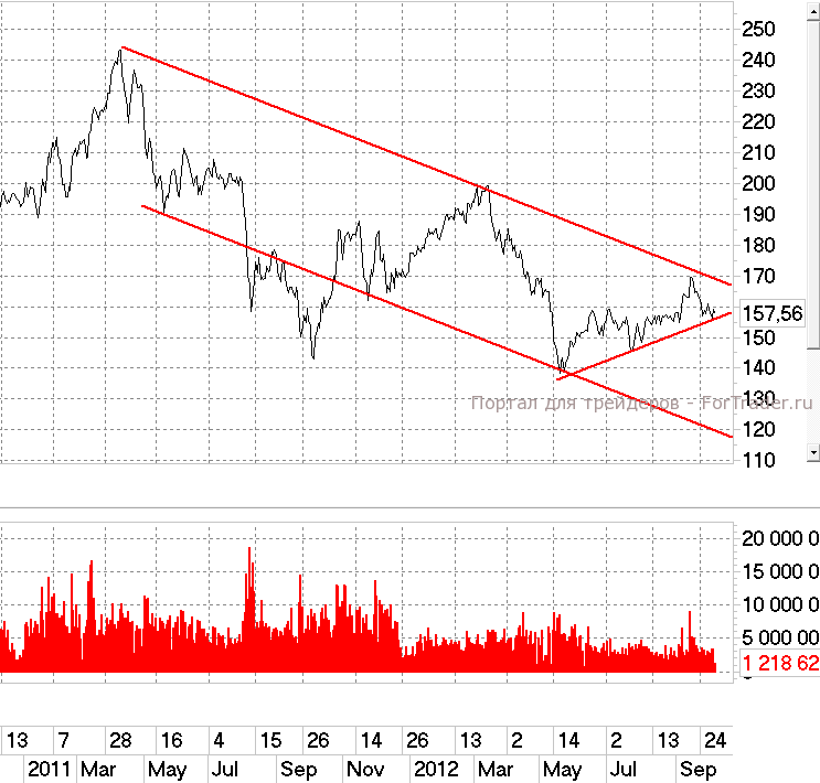 Общий нисходящий тренд может продолжиться в случае закрепления цен ниже 155 руб. за акцию. С технической точки зрения в ближайшее время лучше воздержаться от покупок этого актива для покупок ниже текущих уровней (примерно 110-120) или после преодоления верхних границ канала, возле цен в 150-175 руб. за акцию.