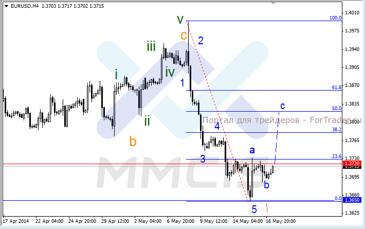 Таким образом, основной сценарий предполагает рост котировки в случае пробоя отметки 1.3730, после чего восходящее ралли будет проходить в рамках волны «с» к уровню 1.3800. В качестве альтернативного сценария рассматривается пробой локального уровня поддержки 1.3650, после чего падение продолжится.