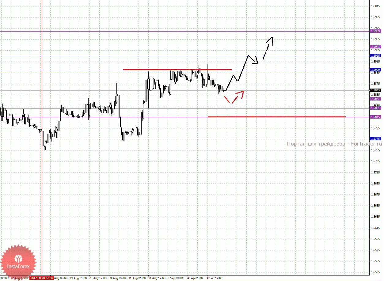По паре Фунт/Доллар ключевыми уровнями являются: 1.56969, 1.5941, 1.5925, 1.5900, 1.5847, 1.5831, 1.5815 и 1.5775. Здесь продолжения движения кверху ожидаем после пробоя 1.5900, в данном случае цель 1.5925, в коридоре 1.5925 – 1.5941 консолидация цены. Потенциальным значением для верха считаем уровень 1.5969, по достижении которого ожидаем откат книзу. Корректировочное нисходящее движение по-прежнему ожидаем в коридоре 1.5847 – 1.5831, пробой последнего значения приведет к углубленному движению, в данном случае цель 1.5815, от этого уровня существует вероятность разворота кверху, его пробой будет располагать к развитию нисходящей структуры, в данном случае потенциальная цель – 1.5775.