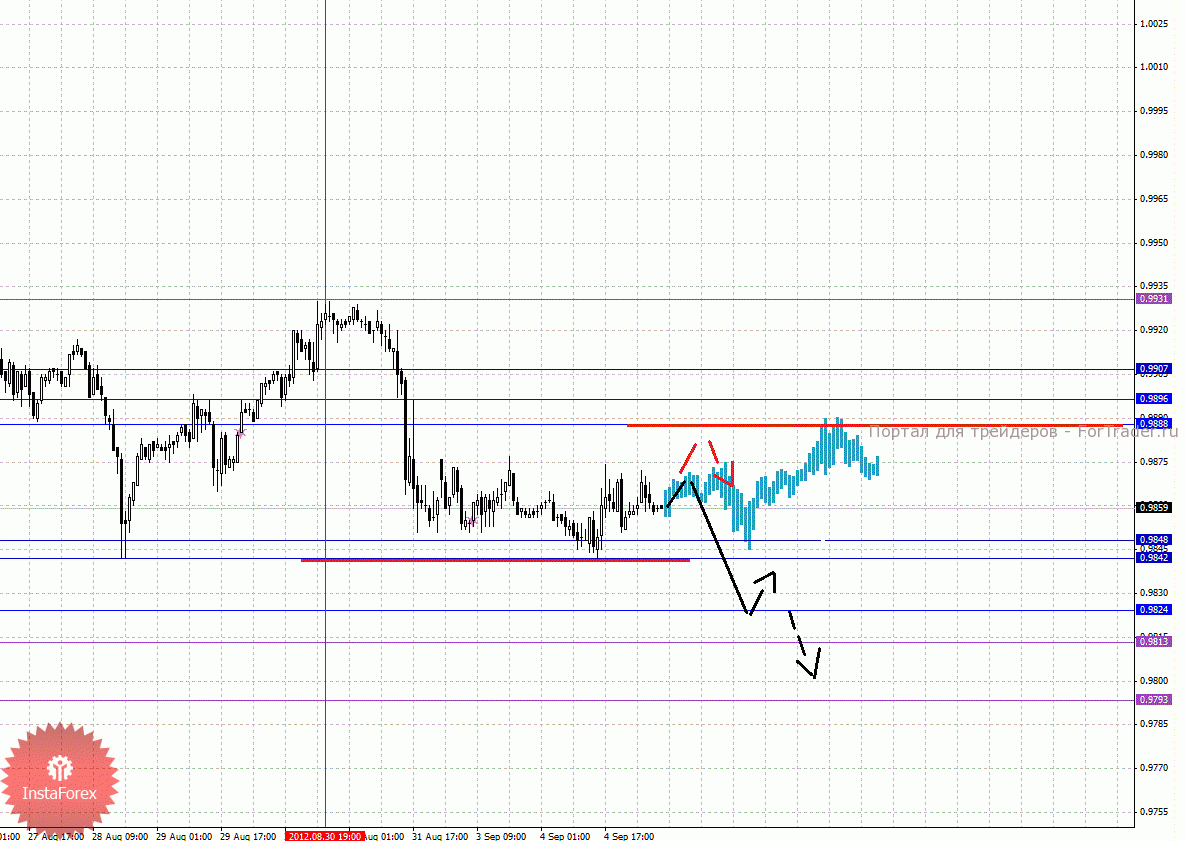 По паре Доллар/Канадский доллар ключевыми уровнями являются: 0.9931, 0.9907, 0.9896, 0.9888, 0.9848, 0.9842, 0.9824, 0.9813 и 0.9793. Здесь мы продолжаем следить за нисходящей структурой от 30 августа. Продолжения движения книзу ожидаем после прохода ценой шумового диапазона 0.9848 – 0.9842, в данном случае цель 0.9824, в коридоре 0.9824 – 0.9813 консолидация цены. Потенциальным значением для низа,считаем уровень 0.9793, по достижении которого ожидаем консолидацию. Корректировочное восходящее движение возможно в коридоре 0.9888 – 0.9896, пробой последнего значения приведет к углубленной коррекции, здесь цель 0.9907, от того уровня существуют вероятность разворота книзу, его пробой будет располагать к развитию восходящей структуры, в данном случае потенциальная цель – 0.9931.