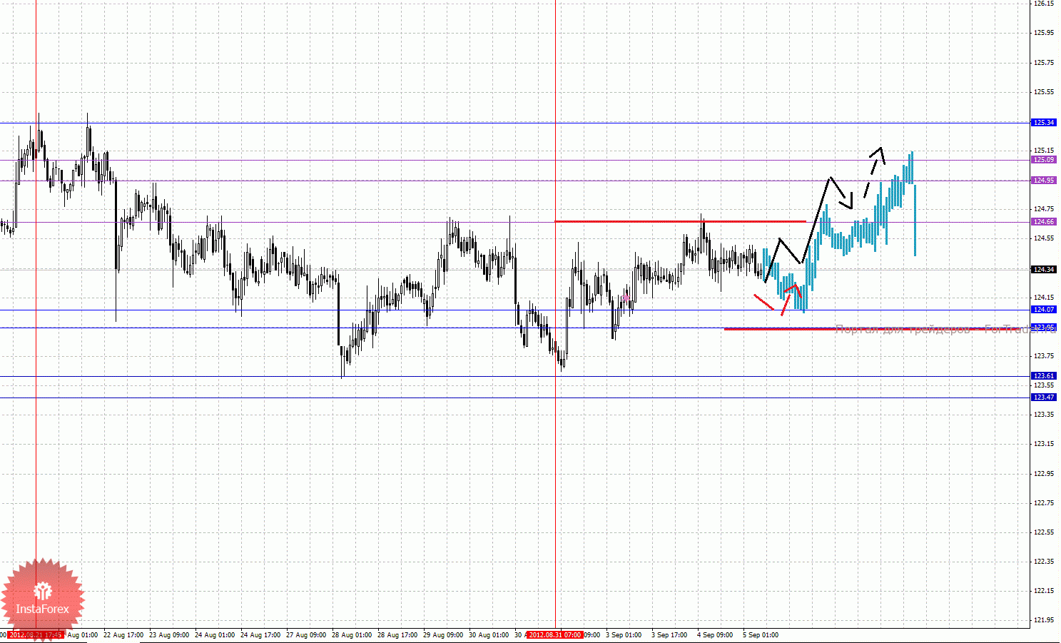 По паре Фунт/Иена ключевыми уровнями являются: 125.34, 125.09, 124.95, 124.66, 124.07, 123.95, 123.61 и 123.47. Здесь продолжения развития восходящей структуры ожидаем после пробоя 124.66, в данном случае цель 124.95, в коридоре 124.95 -125.09 консолидация цены. Потенциальным значением для верха считаем уровень 125.34, по достижении которого ожидаем откат книзу. Диапазон 124.07 – 123.95 является ключевой поддержкой для развития восходящей структуры, проход его ценой позволит рассчитывать на развитие нисходящей тенденции, в данном случае первая потенциальная цель 123.61. Диапазон 123.61 – 123.47 шумовой.