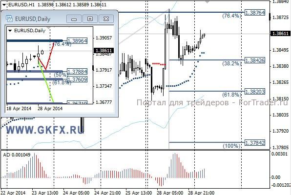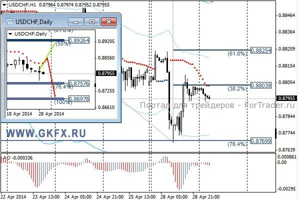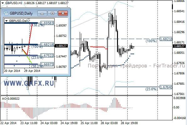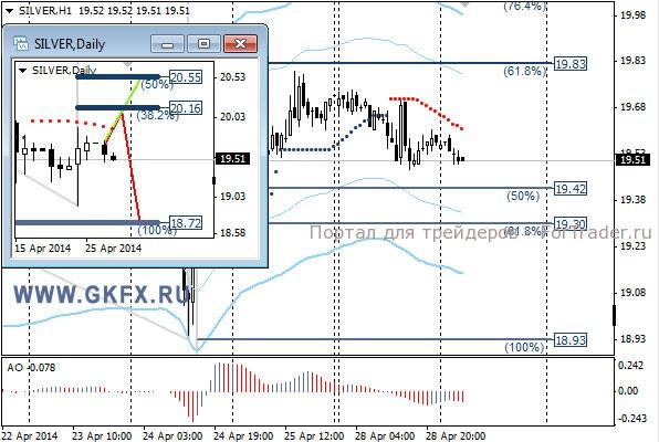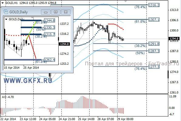 Цены на золото начали неделю со снижения, так как в Украине наступила пауза в дальнейшем развитии событий. Пока там передышка, цены на золото снижаются, плюс ко всему давит на цены ожидания завершения заседания ФРС США и публикация завтрашних данных по ВВП США. В общем, золото находится в ожидании драйверов для дальнейших действий. Закрепиться выше 1300,0 не удалось, поэтому вероятно на этой неделе пойдем вниз. Традиционно делаю два варианта движения цены на неделю, основной красный и альтернативный зеленый. Значимые уровни на сегодня отмечены на часовом графике. Индикатор АО находится в отрицательной зоне и снижается, указывая на желание пары двигаться вниз в данное время. Индикатор тренда указывает на снижение. Вне рынка.