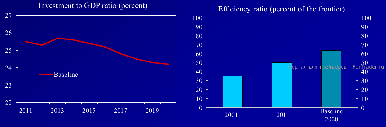 И, напротив, в рамках «реформенного сценария», предполагающего укрепление механизмов экономической политики, снижение краткосрочной волатильности и решительные структурные реформы, моделируется бурный рост инвестиций в реальный сектор. Российская экономика в среднесрочном периоде растет на 6% ежегодно. Повышается ее диверсификация и снижается уязвимость по отношению к турбулентности на международных финансовых и товарных рынках.