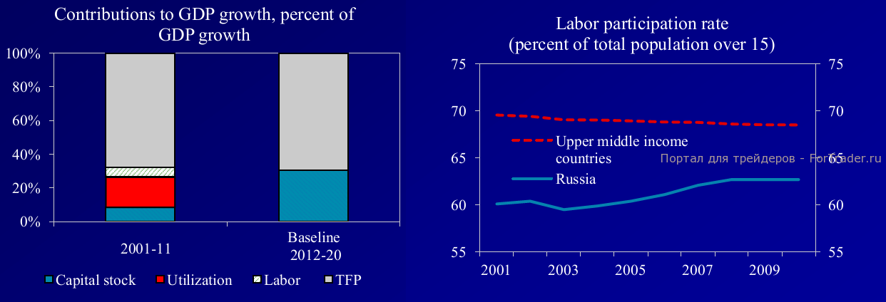 Основными драйверами будущего роста экономики России в 2012-2020 гг. в соответствии с прогнозом МВФ будут совокупная производительность факторов производства и основной капитал. Почему важность факторов труда и коэффициента использования мощностей падает, а важность основного капитала растет?
