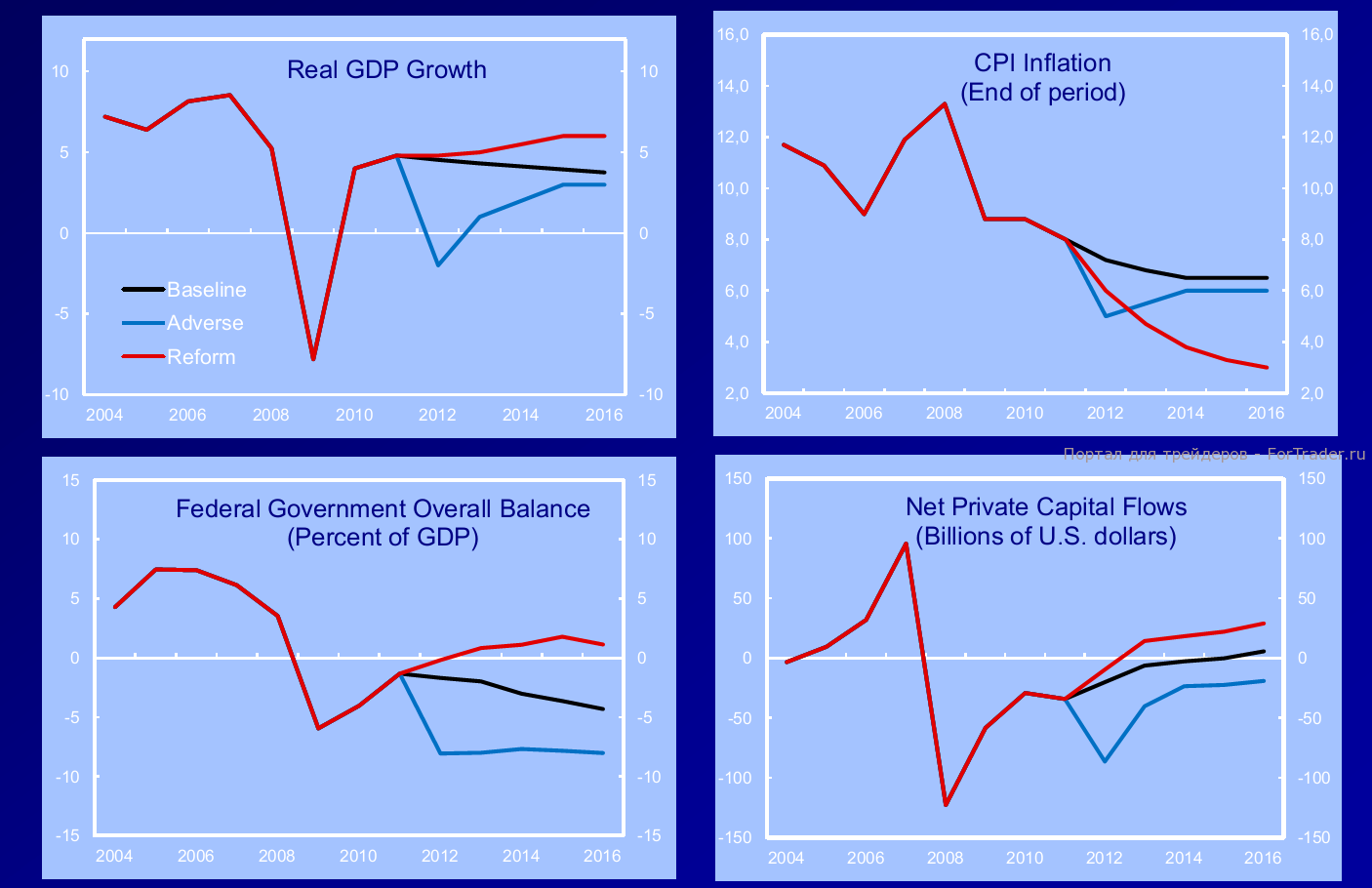 Негативный сценарий показывает, что произойдет, если «нереформированная» экономика в рамках базового сценария испытает шок от падения нефтяных цен до $60 за баррель в 2013 году: ВВП сократится, и в среднесрочном периоде не достигнет даже достаточно скромного уровня, предусмотренного базовым сценарием.