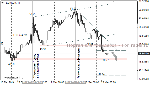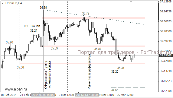 Есть одно важное событие, которое может оказать сильное влияние на рубль. В пятницу в Ростове-на-Дону выступит Виктор Янукович. Точное время пресс-конференции и тема неизвестны. Это будет третья пресс-конференция, и после включения Крыма в состав РФ от него можно ожидать сюрпризов. До начала пресс-конференции участники финансовых рынков будут следить за европейской статистикой.