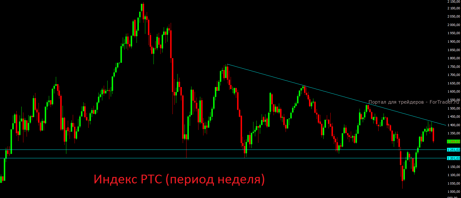 Если взглянуть на недельный график индекса РТС, то цели коррекции находятся в диапазоне 1200-1250 пунктов. Сроки от нескольких дней до нескольких недель.