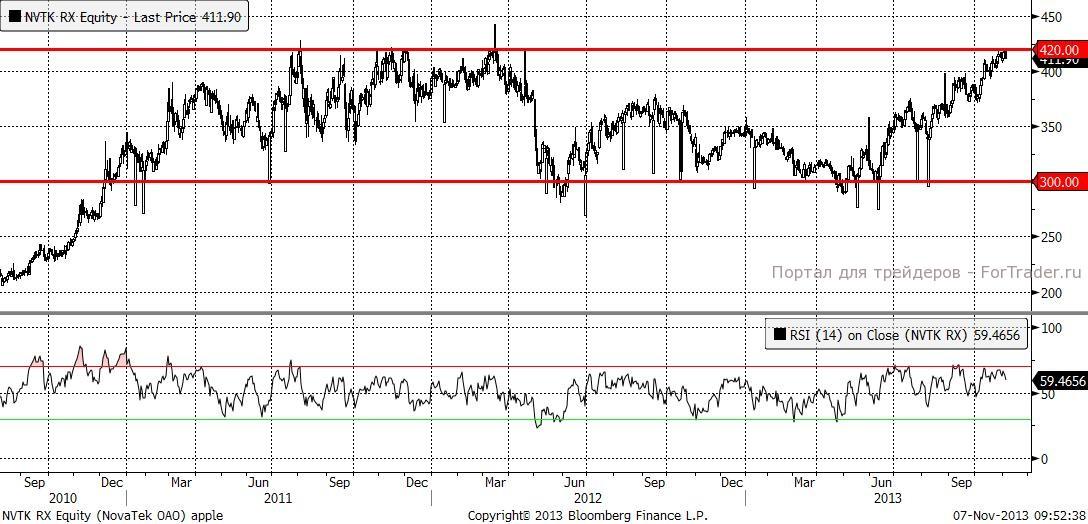 Цена акций НОВАТЭК движется в рамках широкого среднесрочного диапазона 300 – 420 руб., при этом, верхние границы уже затронуты. Согласно техническому анализу наиболее вероятный сценарий это откат цен к уровням 350-370 руб. за акцию.