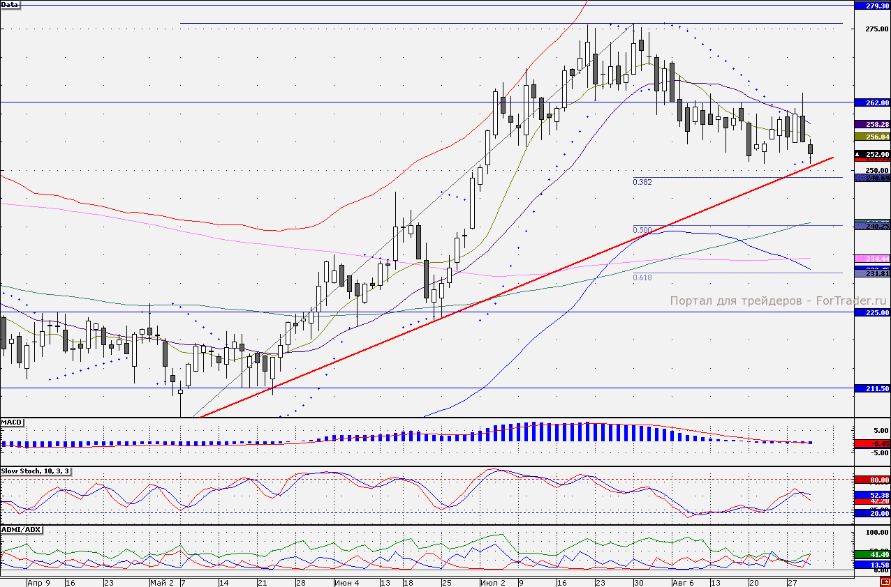 Акции «Уралкалия» сегодня тестируют на прочность линию восходящего тренда, действующего с середины мая. Таким образом, ближайшей поддержкой по бумагам является отметка 250 руб., где также проходит уровень 38,2% коррекции по Фибоначчи проведенной между минимумом мая и максимумом июля. Индикатор ADMI/ADX показывает, что силы «медведей» по бумагам преобладают (линия «медведей» находится выше линии «быков»). При этом линия %D осциллятора медленный Stochastic (10;3;3) находится выше линии %K, что может свидетельствовать о продолжении нисходящей динамики. Наш торговый робот пока удерживает короткие позиции от отметки 256,15 руб., но при улучшении настроений готов перевернуться. На мой взгляд, короткие позиции по бумагам при достижении отметки 250 руб. стоит сокращать и открывать новые только в случае, если данный уровень не устоит. Ближайшим сопротивлением по бумагам выступает 10-дневная скользящая средняя (сегодня 256 руб.).