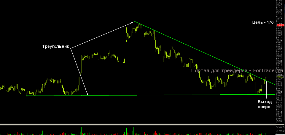 На часовом графике акций Газпрома видно, что цена сегодня в ходе торгов вышла вверх из треугольника, возможно с целью роста примерно на его высоту к недавнему максимуму в районе 170 рублей.