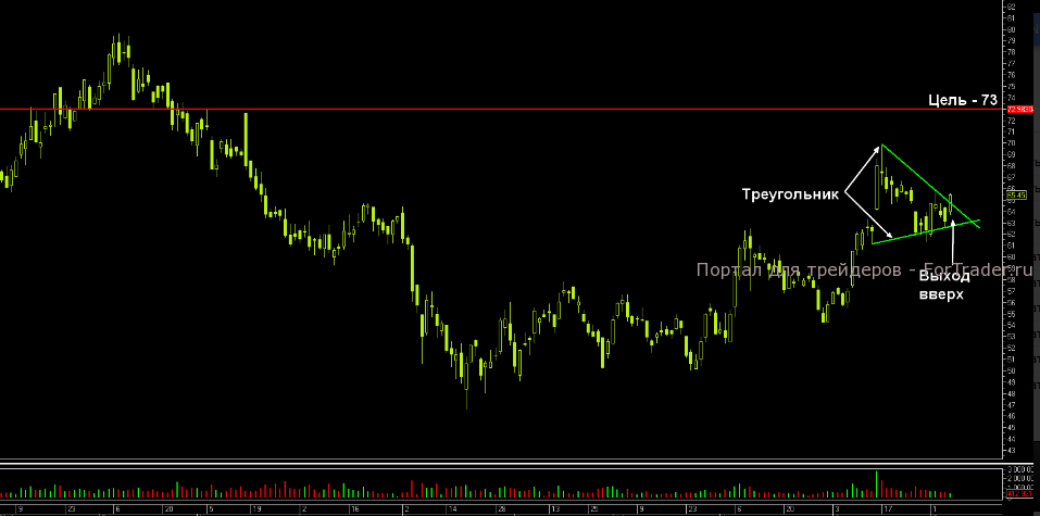 Акции НЛМК с середины сентября консолидировались в рамках треугольника, показанного на графике, из которого цена пытается выйти сегодня в ходе торгов. Если выход окажется не ложным, возможен рост примерно на высоту треугольника в район 73 рублей.