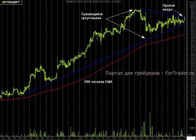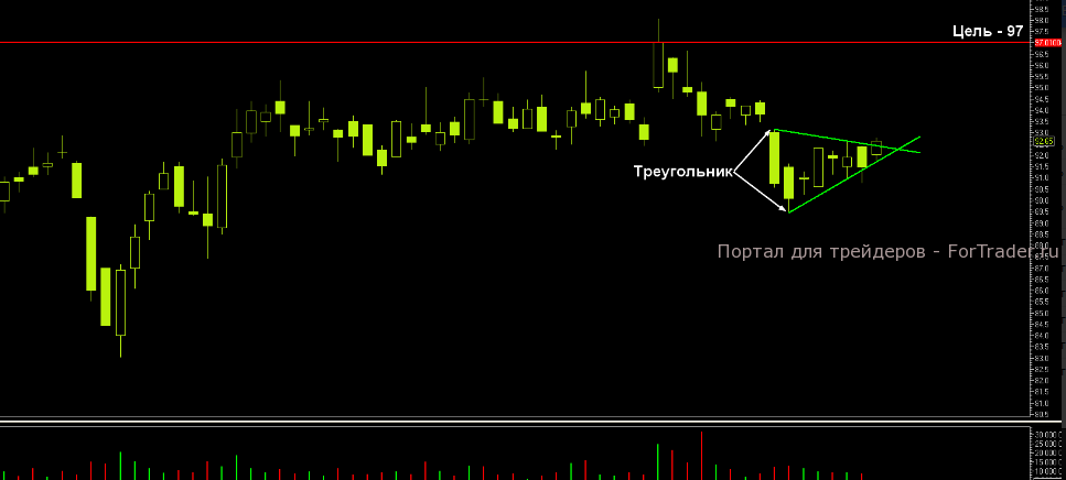 Акции Сбербанка с 26 сентября консолидировались в треугольнике, показанном на графике, из которого сегодня вышли вверх, возможно с целью роста примерно на его высоту в район 97 рублей.