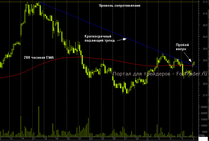 Акции Сургутнефтегаза весь год находятся в широкой консолидации в границах 24-33 рубля. Последние три месяца акции торгуются немного выше середины этого диапазона. Поэтому есть предпосылки к продолжению роста. Сегодня происходит пробой вверх краткосрочного падающего тренда, что может стать началом движения к следующему уровню сопротивления в районе 31,5 рубля.