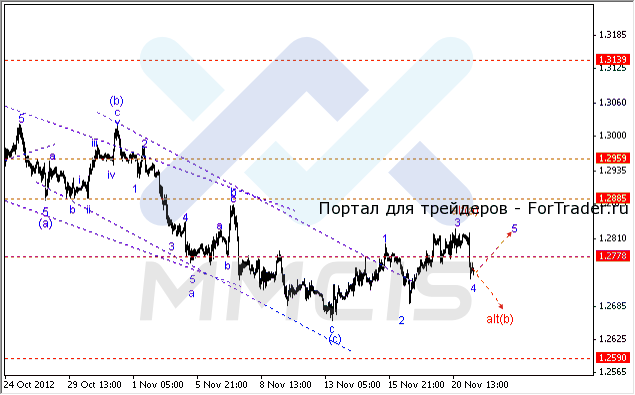 На вчерашних торгах пара евро/доллар продолжила укрепляться, завершая третью волну восходящего импульса. А уже сегодня, на торгах в Азии, пара снизилась к отметке 1.2745, которая представляет собой 38.2% коррекции Фибоначчи от максимума 1.3173. Таким образом, по мнению технических аналитиков, пара сформировала коррекционную волну «4».