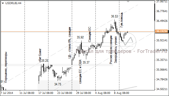 Вечером глава МИД РФ Сергей Лавров заявил, что украинские власти гарантировали безопасность при прохождении гуманитарного конвоя по контролируемой ими территории. Положительный фактор для рубля, но ещё не нашёл отражения в ценах.
