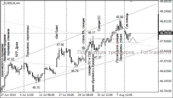 Доллар стабилизировался около уровня 36 рублей, евро около 48 рублей. Есть мнение, что рубль на текущих уровнях останется торговаться до четверга. Российский президент Владимир Путин проведёт в Севастополе совещание с членами Совбеза РФ и 14 августа должен выступить с речью. Его выступление может придать рублю хороший импульс к росту, как это происходило в марте. В среду по рублёвым парам ожидается движение в боковом тренде с ценовым диапазоном 20 копеек.