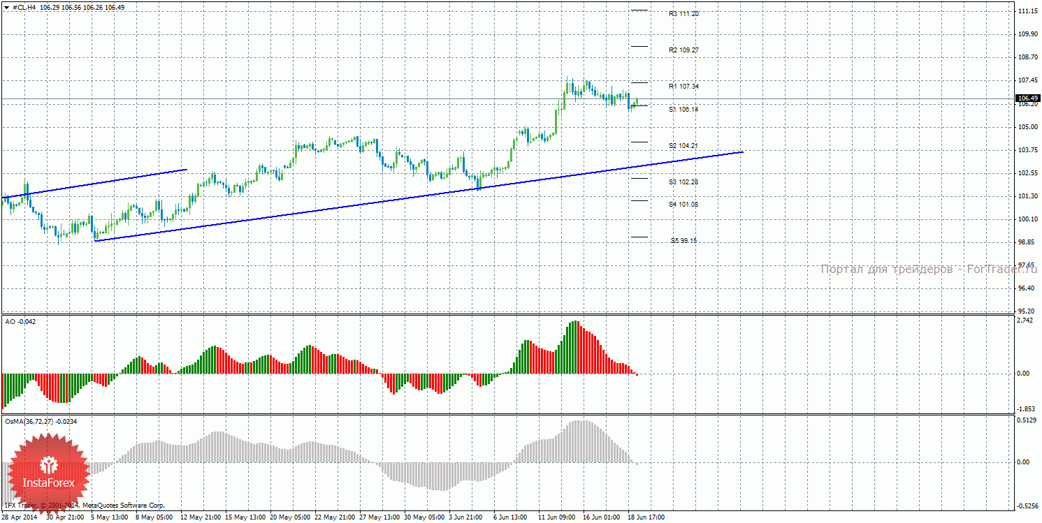 Анализ сырой нефти за 19 июня показывает, что цена продолжает корректироваться и не может преодолеть уровень поддержки S1. Восходящее движение может возобновиться с целями R2 – 109,27 и R3 – 111,20, если цена закрепится выше уровня 107,34. Может продолжиться нисходящая коррекция с целями уровни 104,21 и 102,28, если цена закрепится ниже уровня 106,14. Восходящая линия тренда перестроена и вновь поддерживает торгующих на повышение, делая актуальным восходящее движение. Индикатор Awesome показывает текущее нисходящее движение, так как последний закрытый бар красного цвета. OsMA также направлен вниз, что говорит о нисходящем характере движения и в более долгосрочном плане. Отскок цены от уровня 106,14 может спровоцировать завершение витка коррекционного движения.