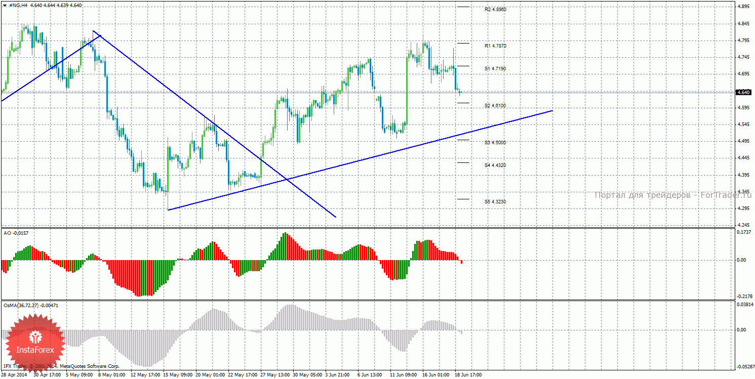 Анализ природного газа за 19 июня показывает, что цена закрепилась ниже уровня 4,7150, что свидетельствует о продолжении нисходящей коррекции. На данный момент актуально восходящее движение с целями уровни сопротивления S1 – 4,7190 и R1 – 4,7870, если цена отскочит от уровня 4,6100. Целями для продолжения нисходящей коррекции выступают уровни 4,6100 и 4,5000. Построена новая восходящая линия тренда, которая оказывает поддержку торгующим на повышение. Индикатор Awesome показывает локальное нисходящее движение, последний закрытый бар окрашен в красный цвет. OsMA также направлен вниз, что сигнализирует о нисходящем движении цены на газ и в более долгосрочной перспективе. Отскок цены от уровня 4,6100 может спровоцировать завершение коррекционного движения.
