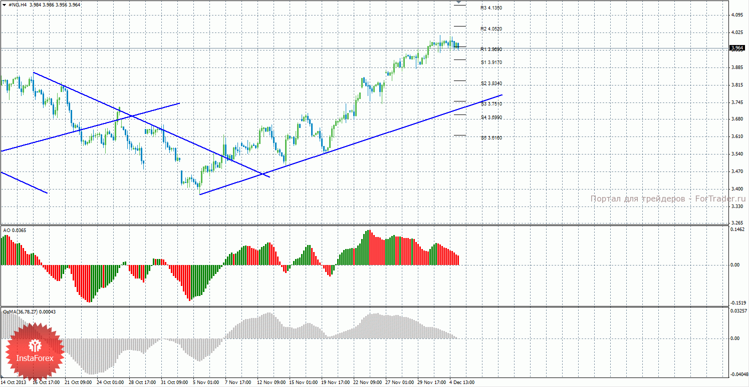 Анализ природного газа за 5 декабря показывает, что индикатор OsMA продолжает разряжаться, а цена продолжает восходящий тренд и находится выше уровня сопротивления R1 – 3,9690. На данный момент актуально восходящее движение с целями уровни сопротивления R2 — 4,0520 и R3 – 4,1350, если цена останется выше уровня 3,9690. Целями для возможного начала нисходящей коррекции выступают уровни поддержки 3,9170 и 3,8340, если цена закрепится ниже уровня 3,9690. Восходящая линия тренда оказывает поддержку торгующим на повышение, ниже нее цена закрепиться пока не смогла. Индикатор Awesome показывает локальное нисходящее движение, последний закрытый бар окрашен в красный цвет. OsMA также направлен вниз, что сигнализирует о нисходящем движении цены на газ и в более долгосрочной перспективе. Индикаторы OsMA и Awesome сейчас продолжают разряжаться. Закрепление ниже уровня 3,9690 может спровоцировать виток нисходящей коррекции.