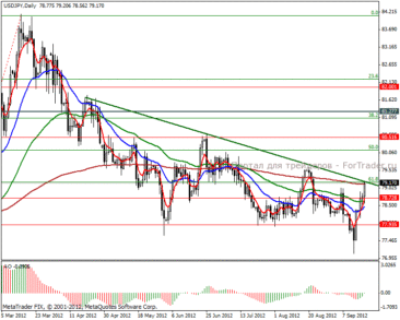 На дневном ценовом графике видим, что цена может отскочить от линии текущей тенденции и вернуться в диапазон 78.72-77.93 пунктов. В случае же ее пробоя цель стоит 81.27 пунктов.