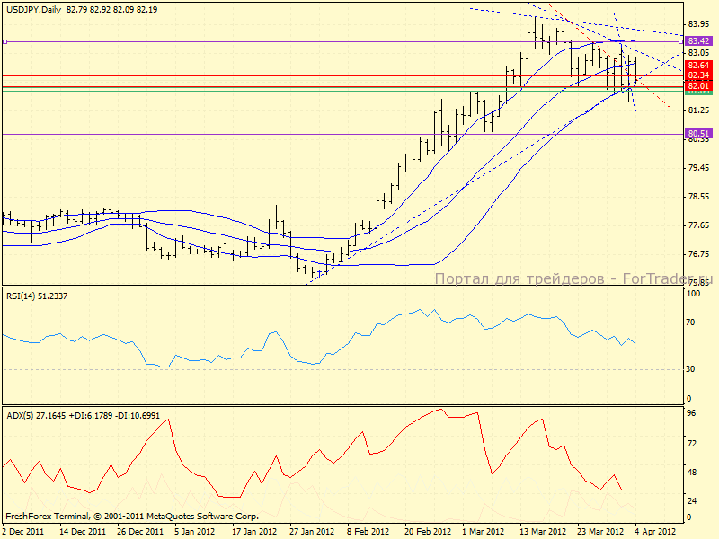 Дневной график: от ппз в районе 81.80 пока отбились, но и сильно задрать пару обратно не удается. С окончательным сломом поддержки 81.86 начнется интнсивный нисходящий тренд с первой среднесрочной целью 80.51.