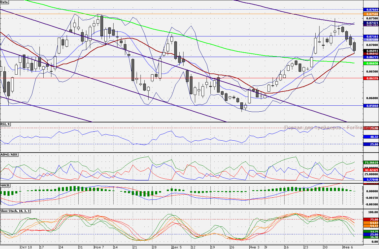 Акции банка накануне удержали 21-дневную скользящую среднюю, которая располагается на отметке 6,842 руб. Пробитие вниз данного уровня приведет к закрытию гэпа от 26 января (6,761 коп.). Сопротивлением для бумаг является психологическая отметка 7,000 коп.