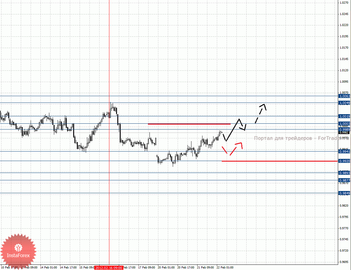 По паре Доллар/Канадский доллар ключевыми уровнями являются: 1.0063, 1.0049, 1.0019, 1.0003, 0.9989, 0.9941, 0.9920, 0.9893, 0.9877 и 0.9849. Здесь цена близка к отмене восходящей структуры от 16 февраля. Проход шумового диапазона 0.9989 – 1.0003 приведет к движению до 1.0019, пробой которого, в свою очередь, начнет развитие восходящей тенденции в масштабе Н1, в данном случае потенциальная цель 1.0049. Диапазон 1.0049 – 1.0063 шумовой. Краткосрочное нисходящее движение возможно в коридоре 0.9941 – 0.9920, пробой последнего значения продолжит развитие нисходящей структуры от 16 февраля, в данном случае первая цель 0.9893.