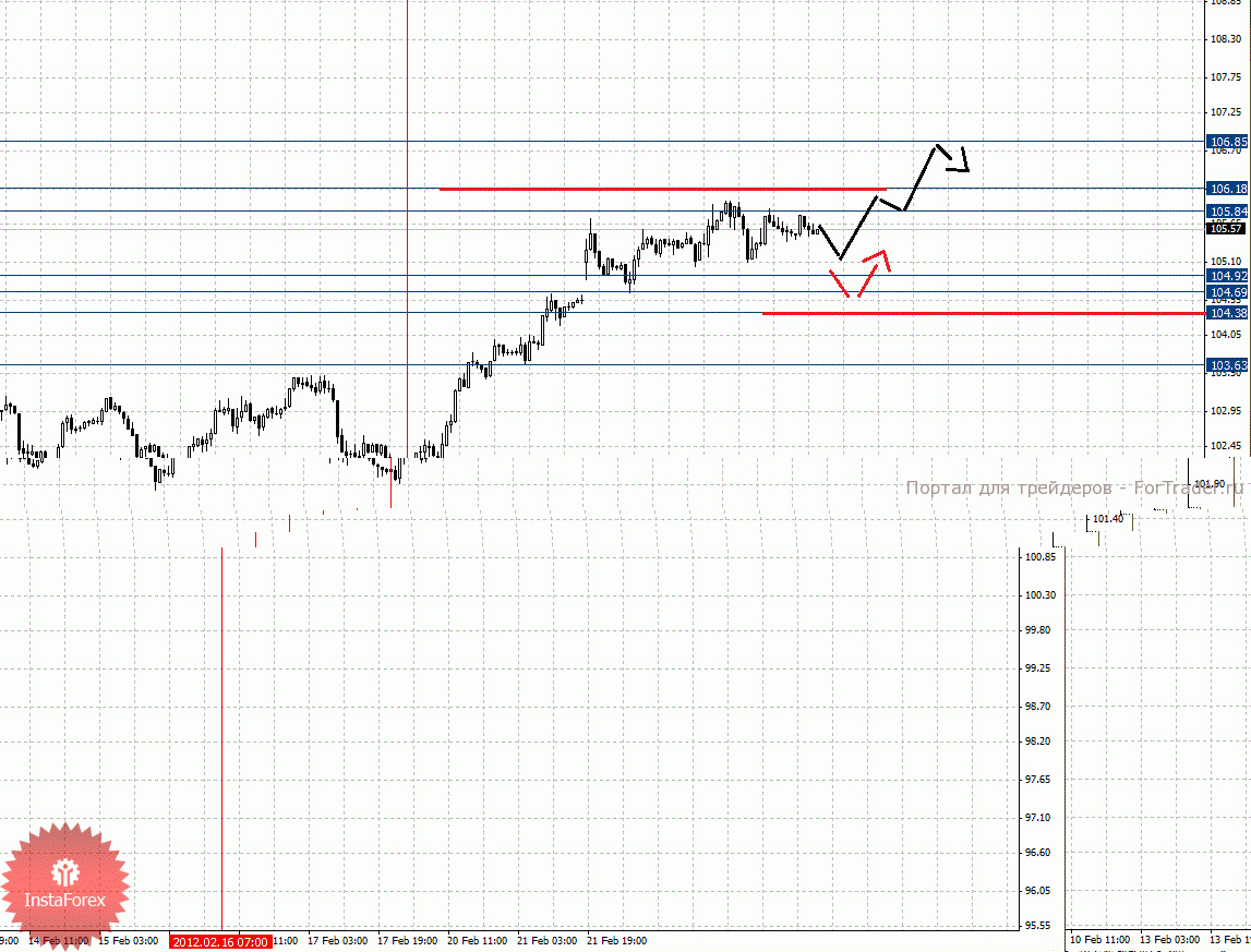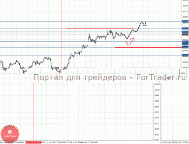 По паре Евро/Йена ключевыми уровнями являются: 106.85, 106.18, 105.84, 104.92, 104.69, 104.38 и 103.63. Здесь мы продолжаем следить за локальной восходящей структурой от 16 февраля. Краткосрочное движение кверху ожидаем в коридоре 105.84 – 106.18, пробой последнего значения позволит рассчитывать на движение к потенциальной цели – 106.85, по достижении этого уровня ожидаем откат книзу. Корректировочное нисходящее движение возможно в коридоре 104.92 – 104.69, пробой последнего значения приведет к углубленной коррекции, в данном случае цель 104.38, от этого уровня высока вероятность разворота кверху, его пробой окажет негативное влияние на развитие восходящего цикла от 16 февраля, в данном случае потенциальная цель – 103.63.