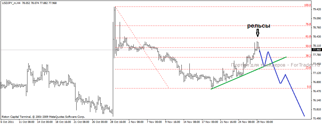 Пара продолжила расти. Возможно быки решили поднять цену к уровню 61.8% фибо, откуда снижение и возобновится, по крайне мере здесь образовался паттерн рельсы, поэтому можно с большой долей вероятности ждать возобновления нисходящего движения.