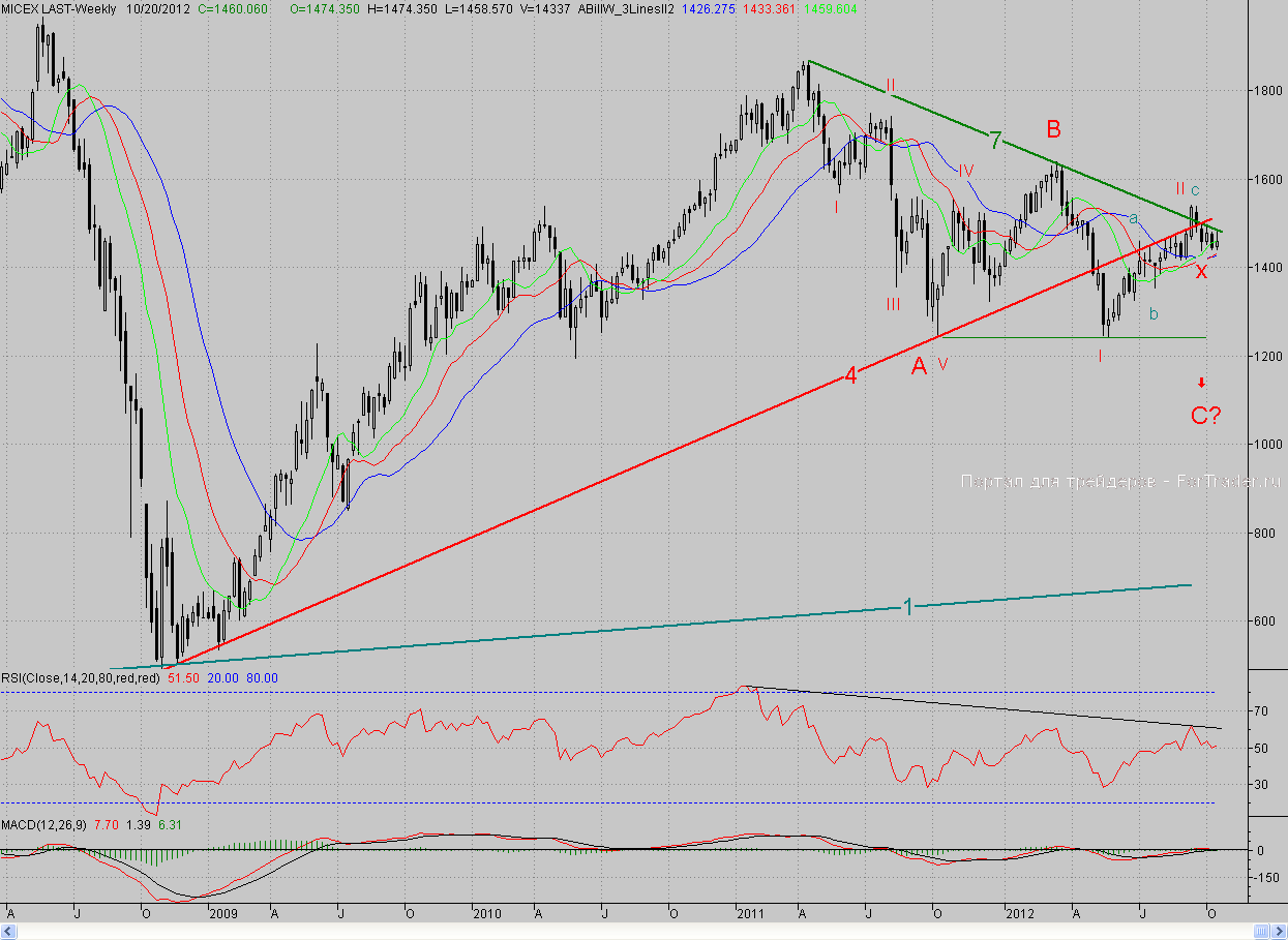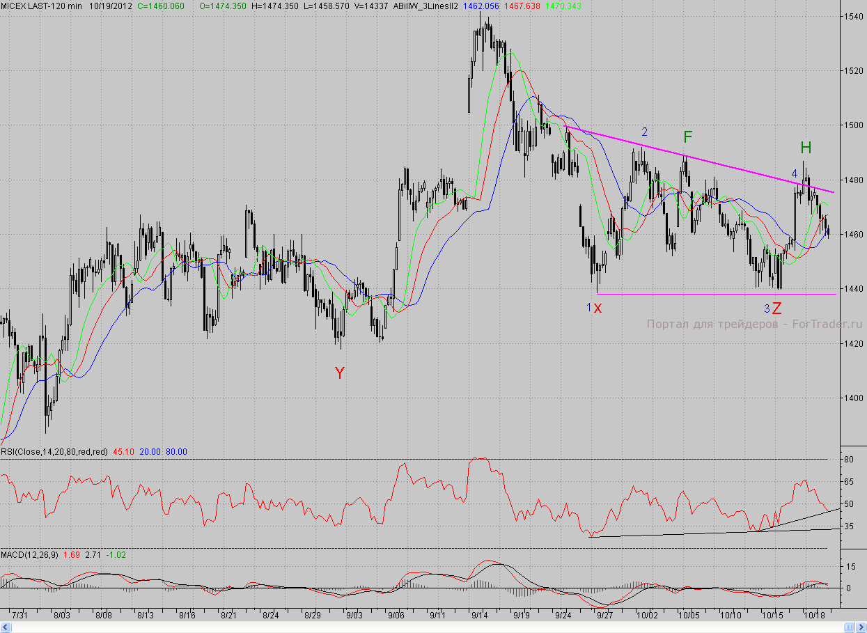 В случае если покупателям удастся переломить негативную тенденцию и направить цены вверх, то ближайшим сопротивлением станет утреннее окно, а далее – район пятничных вечерних максимумов (~1467 п.), более сильным остаётся верхняя грань «треугольника». Экстремум четверга Н (1486,9 п.) с большой вероятностью станет новым дневным фракталом на покупку и будет ключевой цитаделью «медвежьей» обороны. Здесь же проходит и долгосрочный падающий тренд (7), берущий своё начало с апреля 2011 года.