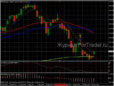 Перейдём к рассмотрению ситуации сложившейся в индексе ММВБ. В четверг индекс ММВБ остановился на отметке 1630,72. Обратимся к дневному временному интервалу. На графике показаны средние скользящие с периодом 60 Moving Average, 90 Moving Average и 200 Moving Average – красного, синего и зелёного цвета соответственно. С 25 апреля 2011 года мы видим нисходящее движение. Характер движения последних четырех свечей привёл к ситуации, когда средняя скользящая 60 Moving Average пересекает среднюю скользящую 90 Moving Average. Данное обстоятельство указывает на продолжение нисходящего движения. Но в нашей ситуации мы имеем также взаимодействие цены со средней скользящей 200 Moving Average. Цена встретила сопротивление именно на уровне данной средней скользящей. 19 апреля котировки индекса ММВБ отскочили от зелёной линии. Цены заключены в рамки: сверху средние скользящие с периодом 60 МА и 90 МА, снизу средняя скользящая с периодом 200 Moving Average. В ближайшее время мы будем наблюдать сужение данных рамок, что приведёт к “взрывному” движению котировок в ту или иную сторону. Чем уже границы, тем сильнее будет движение. Обратим внимание на канал белого цвета. Верхняя граница канала состоит из средней скользящей с периодом 12 и параметром закрытия High. Нижняя граница состоит из средней скользящей с периодом 12 и параметром закрытия LOW. Отметим, что нисходящее движение берёт своё начало от пересечения нижней границы канала дневной свечой от 26 апреля 2011 года. Данная свеча закрылась ниже указанной границы. Дневная свеча от 27 апреля 2011 года закрывается также ниже указанной границы. Далее мы видим несколько красных свечей, закрытие каждой из них ниже предыдущего закрытия и ниже нижней границы белого канала. И только 5 мая свеча, которая обозначена цифрой № 1, является окончанием коррекционного движения. После чего наблюдается ценовой разрыв в направлении вниз. 12 мая 2011 года свеча в очередной раз закрывается ниже нижней границы белого канала. Далее следует очередное снижение котировок индекса ММВБ. Однако в этом снижении котировки встретили сильное сопротивление в качестве средней скользящей 200 Moving Average, что не позволило продолжится нисходящему движению.