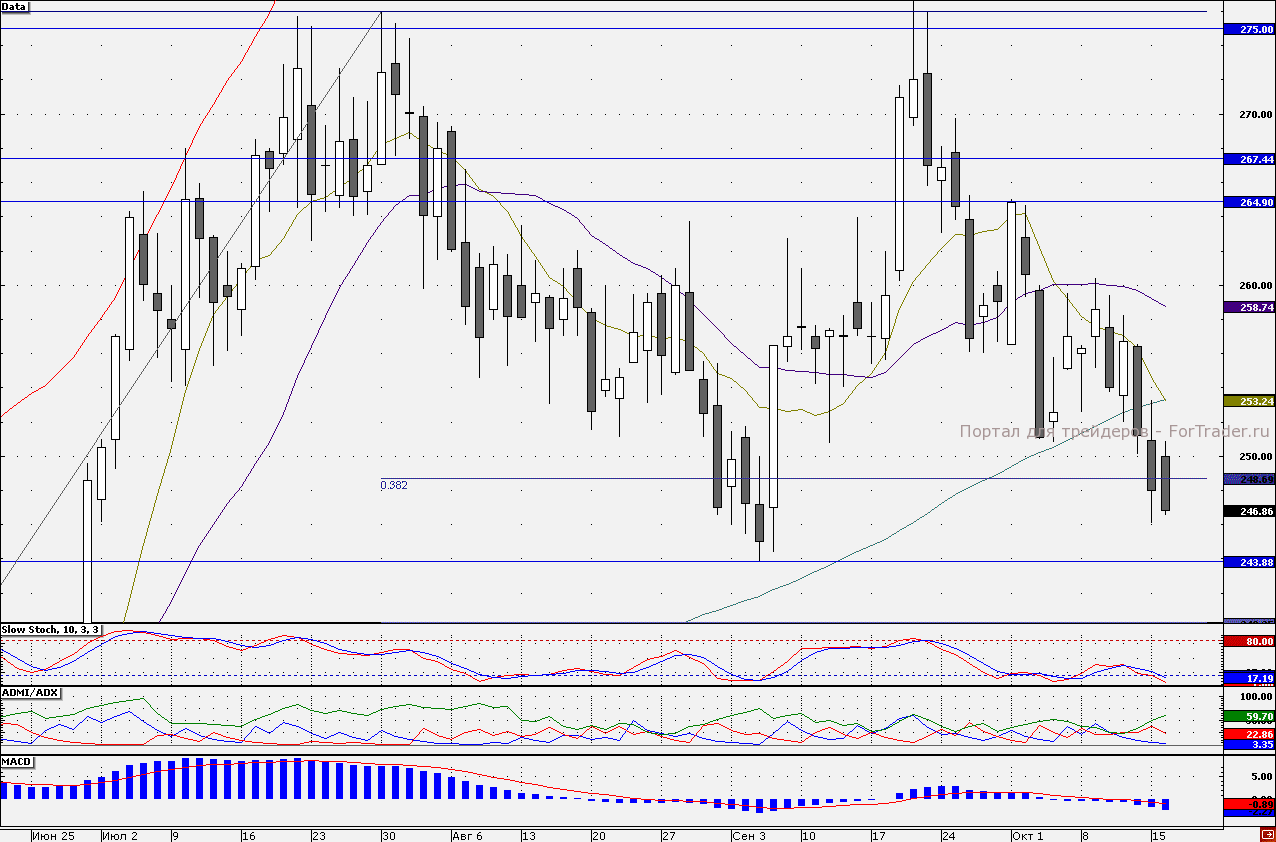 Акции «Уралкалия» вновь демонстрируют нисходящее движение от 10-дневной скользящей средней (253,25 руб.). Ближайшей продержкой по бумагам является сентябрьский минимум на уровне 243,88 руб. Трендовые индикаторы не исключают вероятности продолжения нисходящей динамики акций. Индикатор ADMI/ADX показывает, что силы «медведей» по бумагам преобладают (линия «медведей» находится выше линии «быков», при этом линия ADMI находится достаточно высоко). Сигнальная линия MACD(12;26;9) снижается на отрицательной территории, что также может свидетельствовать о продолжении снижения. Наш 30-минутный торговый робот находится в «шортах» удерживая короткие позиции от отметки 256,41 руб. Таким образом, короткие позиции по бумагам стоит удерживать с ближайшей целью 243,88 руб.