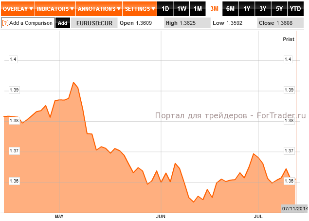 Содержание протоколов и выступления Драги были ожидаемы, поэтому никакой реакции со стороны рынка не последовало. Однако уже на следующий день пара стала снижаться. Курс евро/доллар упал под влиянием падения стоимости акций и облигаций португальского банка Banco Espirito Santo. В четверг 10 июля его бумаги обрушились на 17%, после того как инвесторам стало известно, что материнская компания Espirito Santo International (что можно перевести как «международный святой дух») задержала выплаты по купонам ряда краткосрочных долговых бумаг. Негативные настроения распространились на все рынки, включая валютный. Падение акций спровоцировало опасения, что банки периферийных стран еврозоны опять попали в сложную ситуацию. Соответственно, европейская валюта оставалась под давлением до конца недели и в связи с этим несколько ослабла. К вечеру пятницы пара вновь вернулась к отметке 1,360.