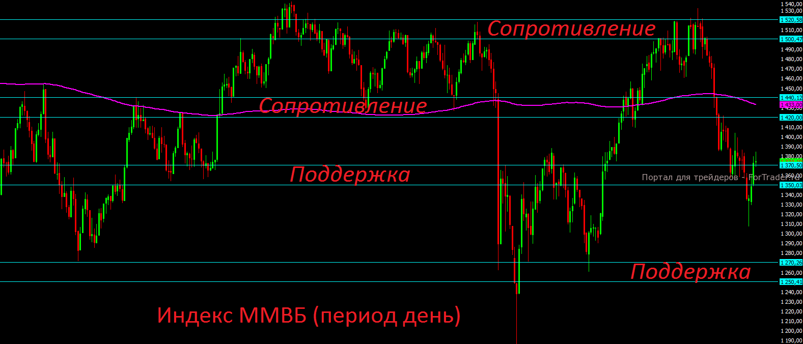 С технической точки зрения российский рублёвый индекс ММВБ пытается удержаться вблизи диапазона поддержки 1350-1370 пунктов. Если в ближайшие дни индекс опустится ниже отметки 1350 пунктов, то мы рекомендуем закрывать все длинные позиции, которые были сформированы на прошлой неделе, а пока есть все шансы, что цена дойдёт до диапазона сопротивления 1420-1440 пунктов.
