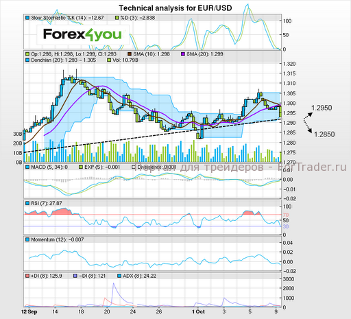 Евродоллар резко упал сегодня утром и вновь коснулся поддержки со стороны верхней линии клина. Снижение было довольно сильным и быстрым, и есть вероятность прорыва поддержки и дальнейшего падения вплоть до уровня 1,2850. В случае отскока, с другой стороны, цена скорее всего вырастет до 1,2950, прежде чем возобновить снижение.