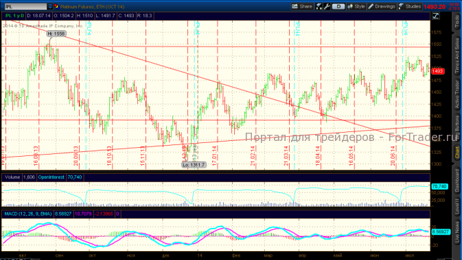 Рынок платины вновь вырастал выше уровня сопротивления 1500$ на фоне роста стоимости золота, но быстро успокоился и снизился к уровню поддержки 1490$.