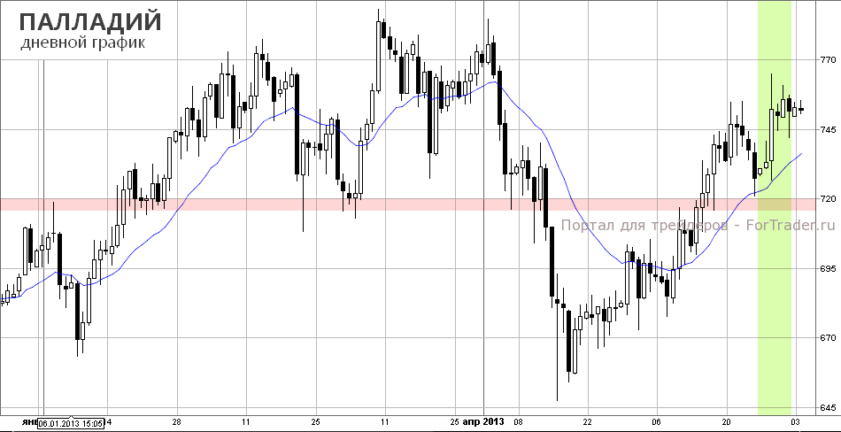 Очередной восходящий импульс на графике палладия последовал за умеренной коррекцией неделей ранее. Помимо ключевой зоны поддержки $715-720, дополнительным графическим сигналом стало касание ценами средней (период 21), что позволило ценам вырасти еще на 3.3%. Таким образом мы видим, что стартовавший в середине апреля up-trend все еще в силе, а любые откаты мгновенно выкупаются участниками торгов.