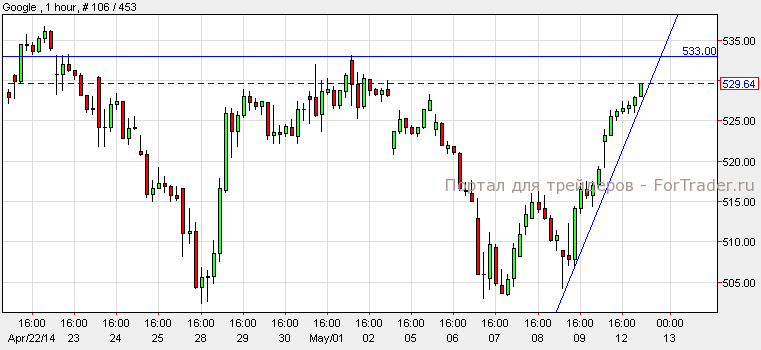 Акции Google выросли на 2.16% и составили 529.92$. Согласно техническому анализу 1-часового графика, акции торгуются с восходящим импульсом к уровню сопротивления 533$. Возможен рост к отметке 550$, если импульс пробьет уровень сопротивления. Однако если прорыв не состоится, акции Google упадут к отметке 500$.