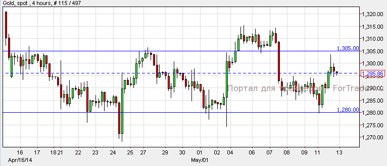Золото подорожало на 8$ и закрылось на цене 1,296$ за унцию, поскольку американские индексы завершили торговый день повышением. Согласно техническому анализу 4-часового графика, золото торгуется в канале между уровнем поддержки $1,280 и уровнем сопротивления 1,305$. Прорыв уровня сопротивления приведет золото к отметке 1,315$, однако, при падении ниже уровня поддержки золото достигнет отметки 1,280$.
