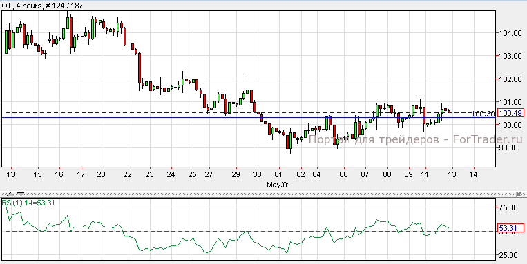 Нефть подорожала на 0.59% и составила 100.65$ за баррель. Согласно техническому анализу 4-часового графика, нефть торгуется с восходящим импульсом, который поддерживается индикатором относительной силы. Чёрное золото пробило уровень сопротивления 100.30$. Удерживая эту динамику нефть может вырасти к цене 105.00$, в противном случае цена упадет до уровня 98.00$.