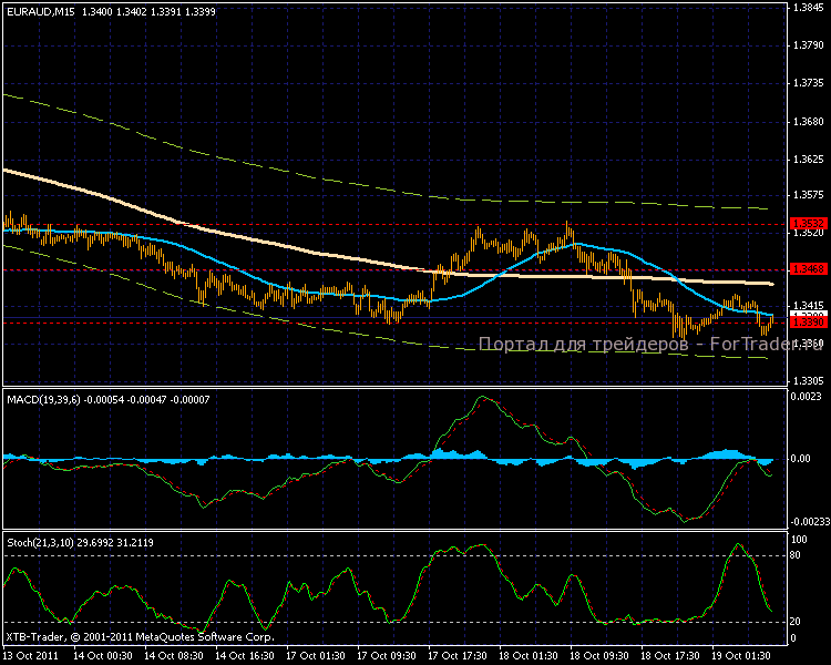 На 15-ти минутном графике боковой тренд в диапазоне 1,3390-1,3532, линии МА практически горизонтальны, индикатор MACD демонстрирует синусоидальное движение без выбора определенной зоны дислокации.