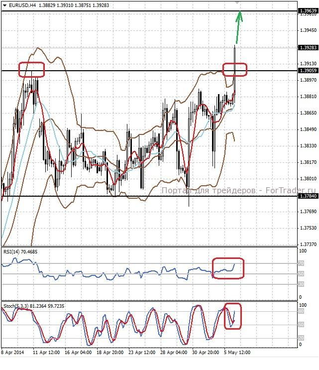 Пара находится в верхней границе полос Боллинджера, но ниже SМА 5 и SМА 13. Индикатор RSI находится выше уровня в 50% и указывает на резкий рост пары. Осциллятор Stoch. также подтверждает стремление пары вверх.