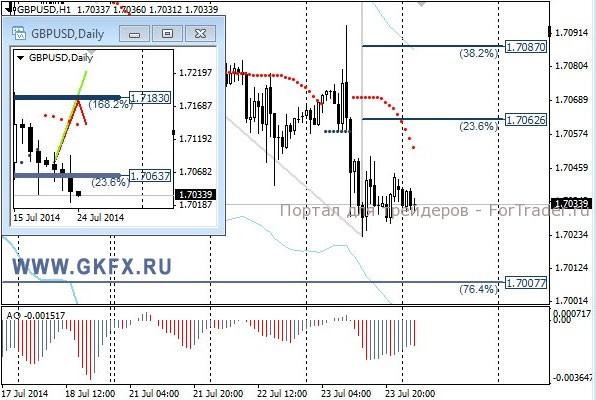 Пара GBPUSD продолжила снижение и исполнила сделку по рекомендации на продажу. Стоп можно установить на 1,7055. Ожидаю сегодня продолжения снижения, которому могут помешать данные по розничным продажам в Великобритании. На эту неделю традиционно рассматриваю два варианта возможного движения цены, основной красный и альтернативный зеленый. Значимые уровни на сегодня отмечены на часовом графике. Индикатор АО находится в отрицательной зоне и растет, указывая на коррекцию перед возможным продолжением роста. Индикатор тренда указывает на снижение. Держим продажи от уровня 1,7040 с целями 1,7010, 1,6970 и 1,6950.