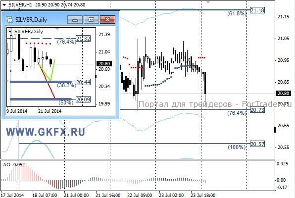 Цены на серебро подошли к уровню поддержки 20,70, который является ключевым для входа в продажи. Готовимся к входу. Традиционно делаю два варианта движения цены на неделю, основной красный и альтернативный зеленый. Значимые уровни на сегодня отмечены на часовом графике. Индикатор АО находится в отрицательной зоне и снижается, указывая на желание инструмента двигаться вниз в данное время. Индикатор тренда указывает на снижение. Преодоление 20,70 позволит продать с целями 20,57, 20,30 и 20,16.